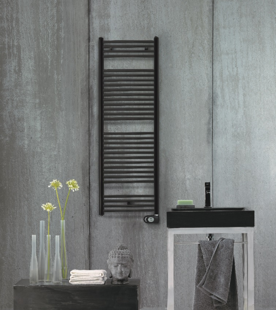 Zehnder Aura Black Elektromos, egyenes, fürdőszobai radiátor FEKETE 600x1500 PBEBZ-150-060/MQ Elektromos üzemű, programozható fűtés, egyenes kivitel, MATT FEKETE változat, dugvillával, gyárban feltöltött hőátadó folyadékkal