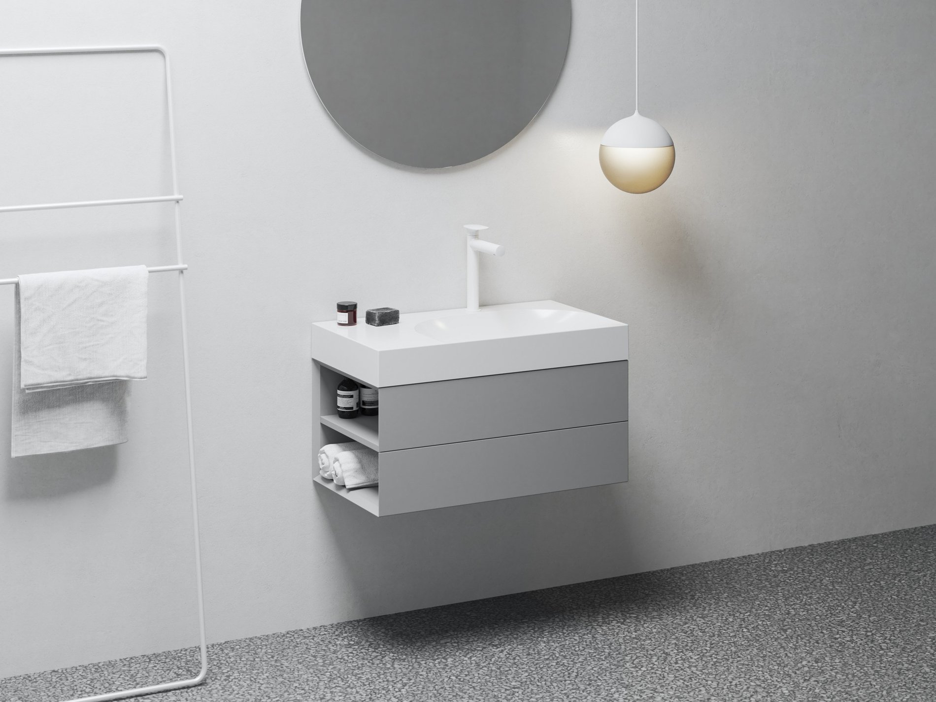 Az SD Lite 80 B-es mosdószekrény Lite 80/45 B-es és Lite 80/60 B-es mosdóhoz készült. Két első fiókkal és két oldalsó polccal van felszerelve. A szekrényfiók az elülső oldal szélének meghúzásával nyílik. Összeszerelve szállítjuk, beleértve a rögzítőkészletet (csavarok, zsanérok, zárósapkák). A szekrény a falra van szerelve.