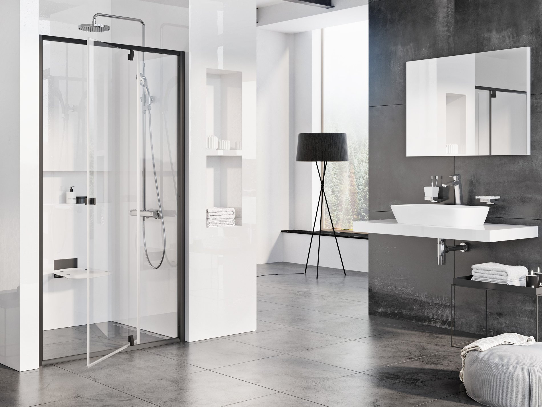 Kétrészes zuhanyajtó fekete kerettel, fogantyúkkal és zsanérokkal. Átlátszó, edzett biztonsági üvegből készült, Ravak AntiCalc® vízlepergető réteggel ellátva. Pivot, forgózsanéros nyílórendszer. Forgatható termék bal és jobb oldali kivitel kialakításához.