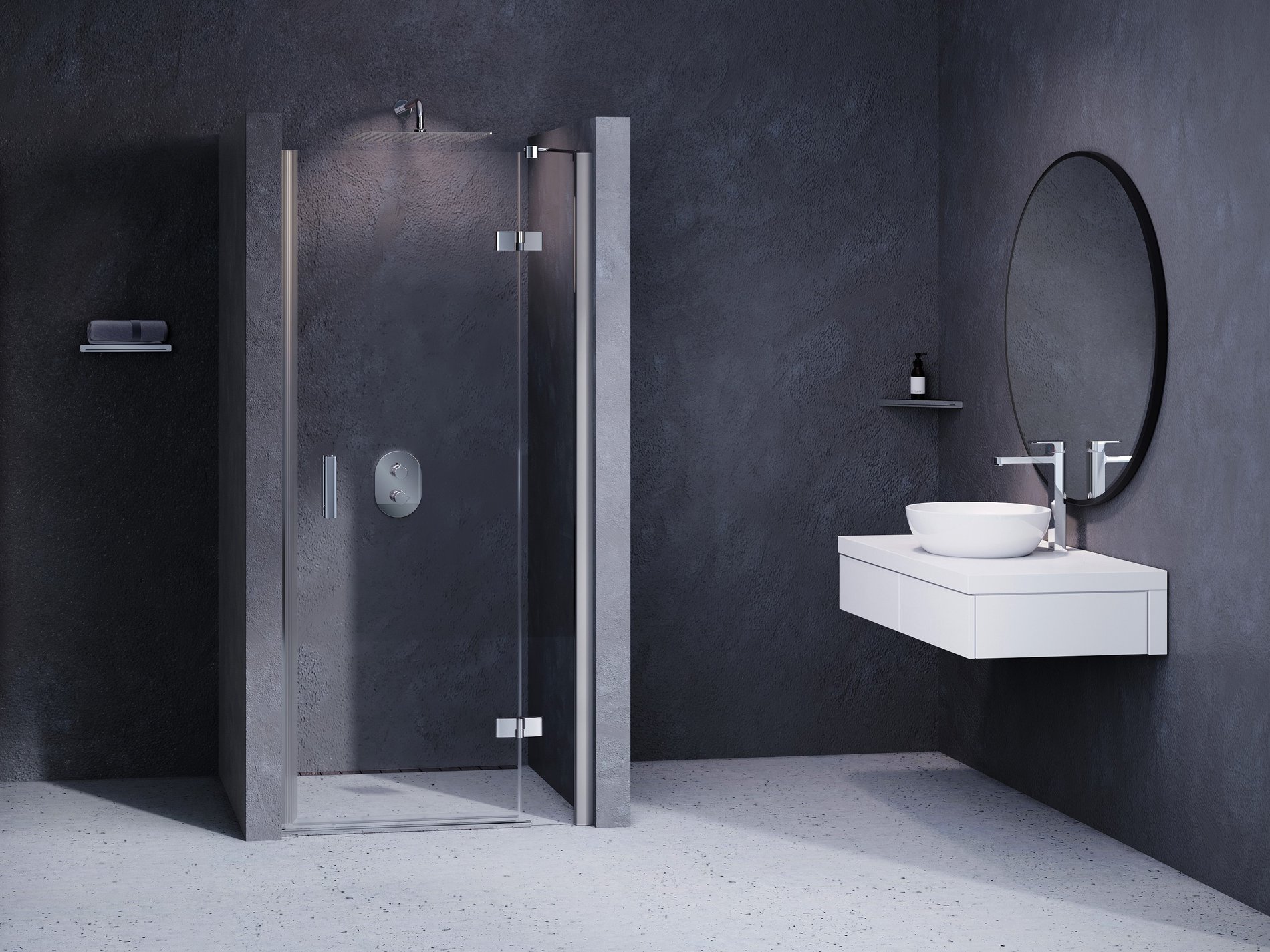 Kétrészes zuhanyajtó fényes króm merevítővel, átlátszó biztonsági üveggel, Ravak Anticalc® védőréteggel. Zsanéros nyíló rendszer. Jobbos változat.