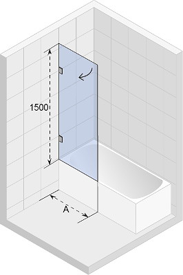 Kádzuhanyajtó, válaszfalként a kádban zuhanyozáshoz, edzett 8 mm vastag üveg RIHO pajzsgal, két zsanérral a falon, téglalap alakú kádakhoz, kifelé forgatható.
