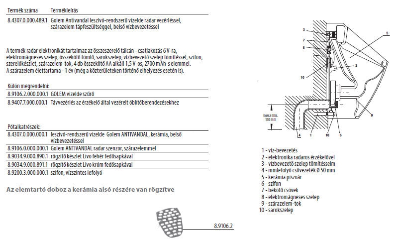 Golem Antivandal leszívó-rendszerű vizelde radar vezérléssel, szárazelem tápfeszültséggel, belső vízbevezetéssel.